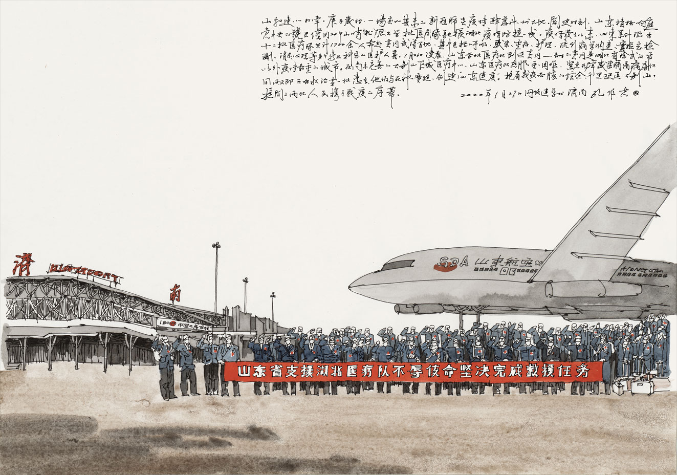 “敬禮!”一身制服、一個軍禮。2月9日,濟南遙墻國際機場候機大廳里,一位男子這樣送別即將出征的妻子。