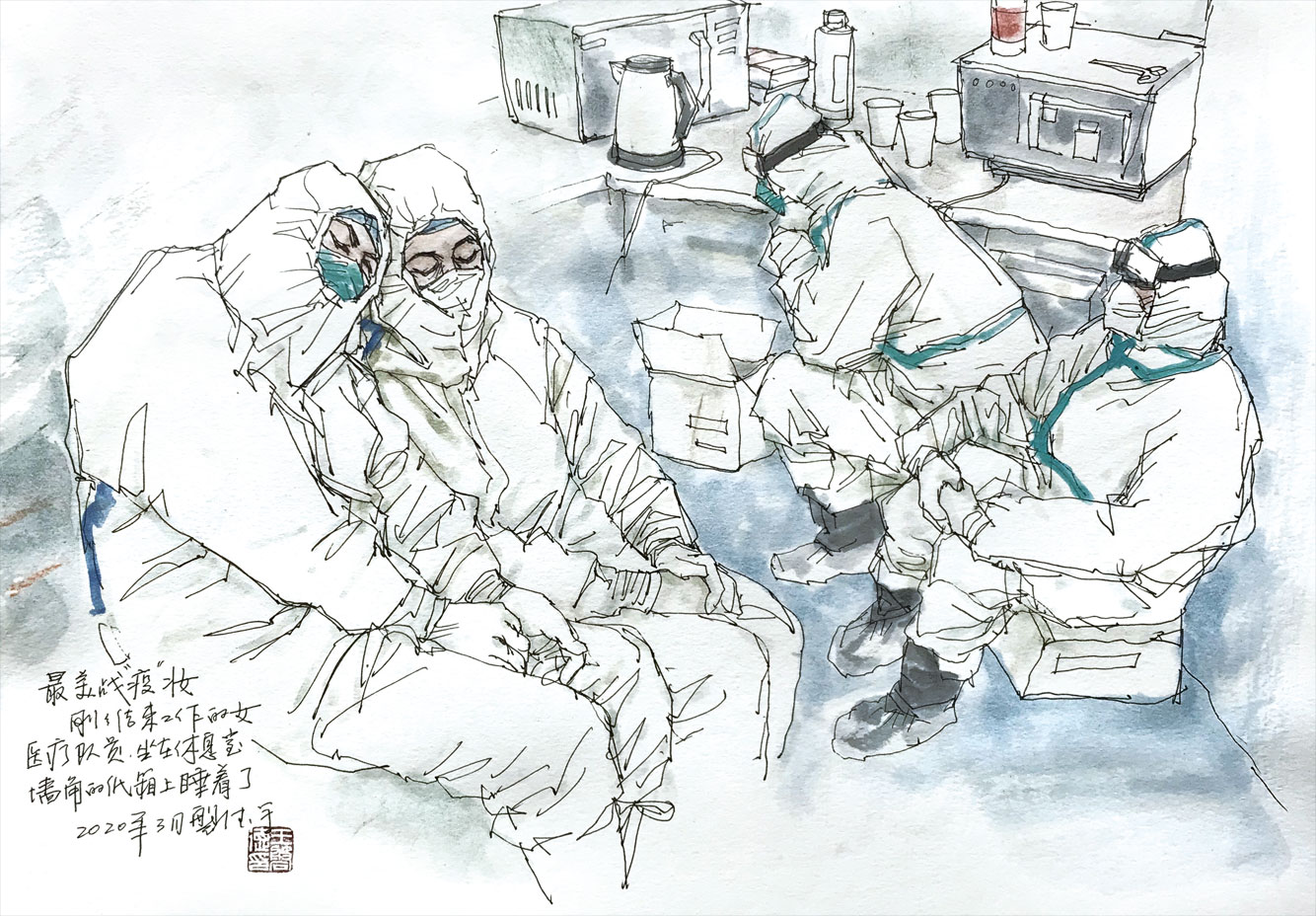 在他心中,已經(jīng)將這勒痕與壓瘡當作了戰(zhàn)“疫”中最珍貴的勛章。再看一眼旁邊幾名女同事,嗯,這大概就是2020年最美的“妝容”吧。
