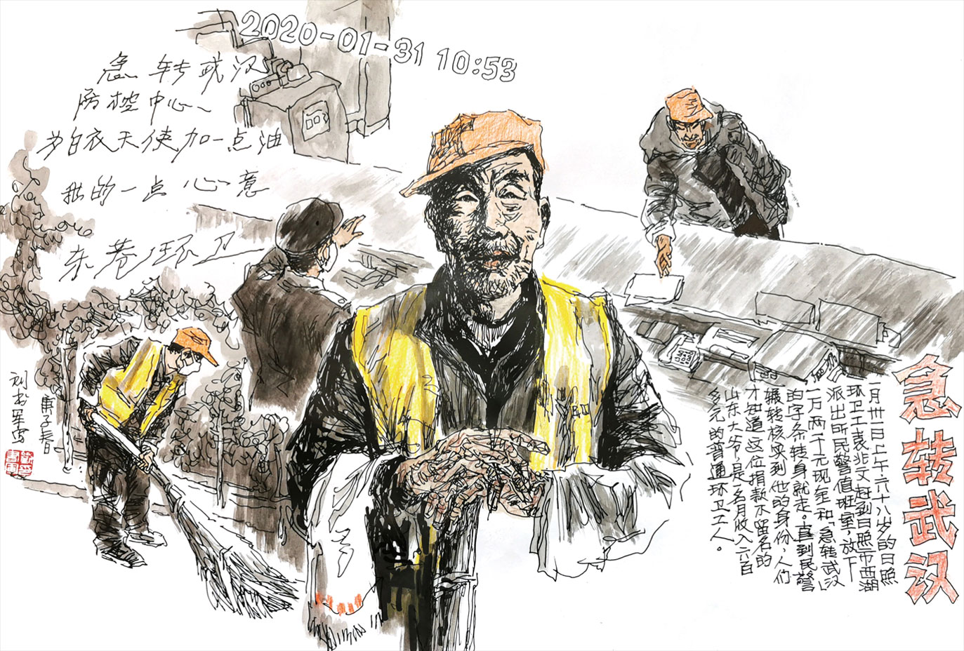一身灰白色棉襖,一頂橘紅色環(huán)衛(wèi)帽,一副口罩遮面。就是這樣一位其貌不揚的大爺……