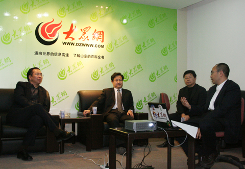 國務院新聞辦副主任王國慶(左)在山東省委宣傳部副部長劉保聚陪同下聽取大眾網工作匯報