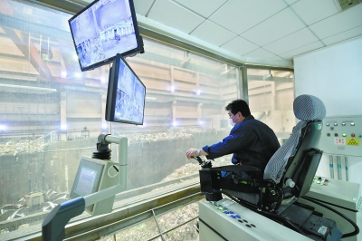 昨天(25日),在首鋼生物質能源科技有限公司焚燒廠房,工作人員正在進行垃圾處理。記者 方非攝