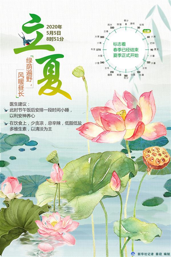 新華社天津5月3日電(記者周潤健)“忽驚夏向明朝立,便恐春從此地更。”《中國天文年歷》顯示,北京時間5月5日8時51分,迎來二十四節(jié)氣中的“立夏”,這一天在天文學上是告別春天、迎來夏日的轉(zhuǎn)折點,標志著春季已經(jīng)結(jié)束,夏季正式開始。此時節(jié),綠蔭遍野,風暖晝長,橫塘新荷,花叢蝶忙。