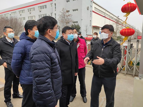 膠州市委常委、政法委書記孫曉兵(右一)在檢查疫情防控工作
