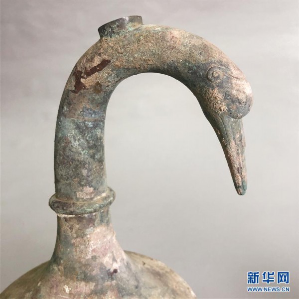 河南省三門峽市文物考古研究所的考古工作者近日在當地一個發掘現場,發現一個鵝首曲頸青銅壺。新華社記者 李麗靜 攝 祝曉東說,當時的青銅壺壺首多為蒜頭造型,以天鵝、大雁、鴨子等動物造型為壺首的也有,但較少。 [詳細]