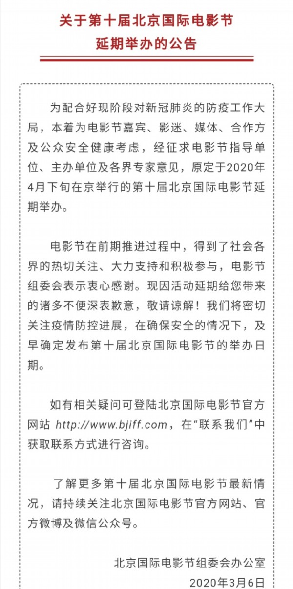 3月6日晚,北京國際電影節官方微博發布公告,為配合好現階段對新冠肺炎的防疫工作大局,本著為電影節嘉賓、影迷、媒體、合作方及公眾安全健康考慮,經征求電影節指導單位、主辦單位及各界專家意見,原定于2020年4月下旬在京舉行的第十屆北京國際電影節延期舉辦。