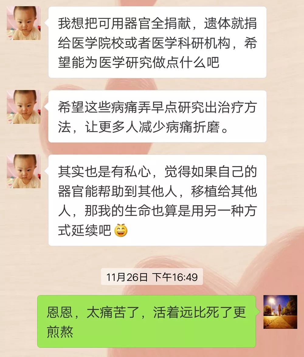 她柔弱的氣息,柔弱的肩膀,已經(jīng)承擔(dān)不起癌癥的折磨和命運(yùn)的不公。4次化療剝奪了她的秀發(fā),憔悴蠟黃的面色之下是一顆善良、勇敢的心“我生病的時(shí)候,有太多人幫助過我,我沒法當(dāng)面對(duì)他們說一聲謝謝······我死了,把能用的器官捐出去,遺體做研究,希望能做點(diǎn)什么吧。”