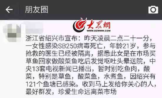 3月20日前后,在不少聊城網民的手機朋友圈、QQ群中出現這樣一條消息:“山東聊城防疫局宣布:昨天凌晨二點二十一分,一女性感染SB250病毒死亡,年齡21歲,參與搶救的醫生已經隔離。據悉此女是在市場買鯇魚回家做酸菜魚吃后發覺嘔吐頭暈送院,中央13套電視新聞已播出,暫時別吃魚肉、酸菜,特別是鯇魚、酸菜魚、水煮魚,因聊城121個魚塘已感染。收到馬上發給你關心的人,最好群發。”