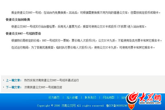 濟南公交總公司官網曾對BRT1號線票價作出定價2元的說明。