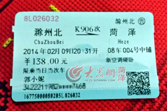 2月9日晚上8:31,東明尋親女孩郭小妮就要踏上到菏澤的火車(chē)了。下午4:30,郭小妮在安徽滁州家里忙著整理臨行前的行李,間隙,她通過(guò)QQ向大眾網(wǎng)記者展示了來(lái)菏澤的火車(chē)票。