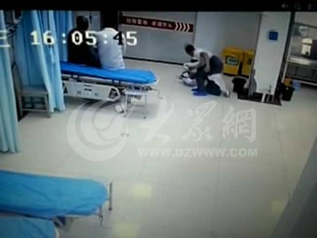 德州市人民醫(yī)院傷人事件,一名男子正在傷害倒地的醫(yī)生。(網(wǎng)友拍攝視頻截圖)
