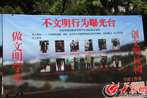 山東外國(guó)語職業(yè)學(xué)院學(xué)生在曝光臺(tái)前觀看各類不文明行為照片。
