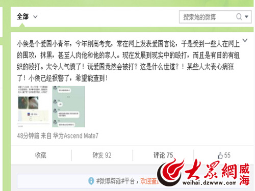 今天下午,多名網友在微博發消息稱,威海青年@侯聚森-側衛36 因為發表愛國言論,被人在校門口群毆受傷,并貼出了其受傷的照片。該消息很快在微博上傳播和轉發。