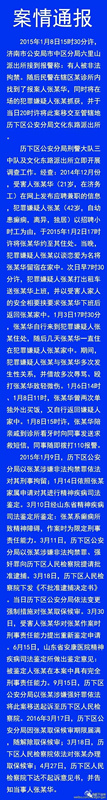 今年7月7日,濟南市歷下區公安分局通過官方微博發布了此案的案情通報。案情通報稱,2015年1月8日15時30分許,濟南市公安局市中區分局六里山派出所接到報警稱:有人被非法拘禁。隨后民警在轄區某診所內找到了報案人張某華,同時將在場的犯罪嫌疑人張某抓獲,并于當日20時許將此案移交至管轄地歷下區公安分局文化東路派出所。