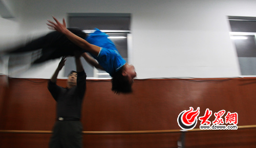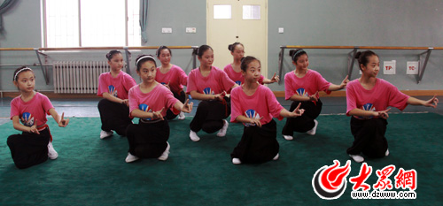 9月21日下午,記者來(lái)到山東省電影學(xué)校的練功房,該校2011級(jí)京劇班的學(xué)生正在上基訓(xùn)課,三個(gè)剛剛?cè)雽W(xué)的2011級(jí)京劇班女生朱釩萌、仉澤宇、楊雨辰正在壓腿,而這三個(gè)女生都是來(lái)自濟(jì)南的。其中,9歲的朱釩萌是育新小學(xué)的,12歲的仉澤宇是千佛山小學(xué)的,11歲的楊雨辰是歷下實(shí)驗(yàn)小學(xué)的,3個(gè)人都考上了山東省電影學(xué)校2011年的京劇班,而她們的目標(biāo)都是——“長(zhǎng)大了考中國(guó)戲曲學(xué)院,成為名角!”