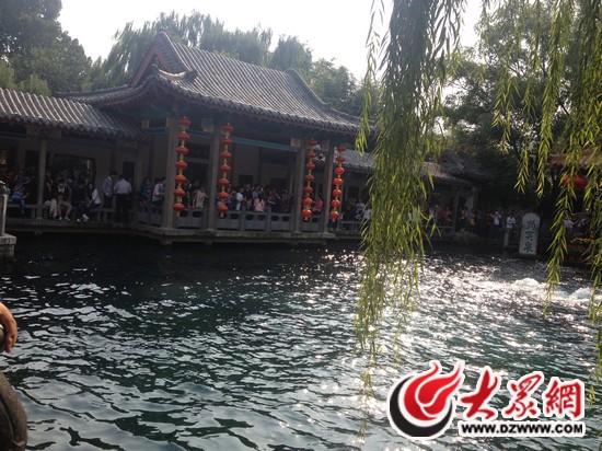 而趵突泉周圍的石橋和連廊上,更是里三層外三層地擠滿了人。后面的保安不停地提醒大家不要翻護欄,卻還是有不少游客站在護欄里面,很是危險。