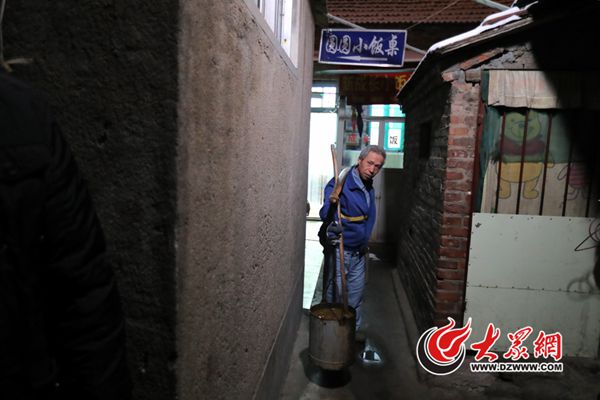 院子里灰蒙蒙的,拐進角落里的夾縫,眼前一處說不清是簡易房還是棚子的建筑,就是廁所。說是廁所,其實就是在地上挖了個坑,兩側壘幾塊磚頭墊腳,講究點的會用水泥抹個臺子。大眾網記者探頭一望,坑里的糞便不算多,也沒怎么上凍,混著些泥水和渣滓。幾個人輪流用糞勺將這些混合物舀進糞桶,扁擔上肩,身體微傾,稍一發力,便穩穩地挑起了兩桶糞水。