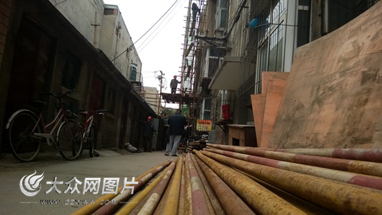 10月12日上午,濟(jì)南歷山東路2號(hào)膠帶固定開裂縫隙居民樓前,搭建腳手架的鋼管木板等準(zhǔn)備就緒,兩個(gè)單元前的腳手架已經(jīng)搭建好。記者 馬俊驥 攝