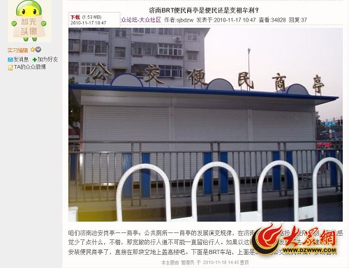 大眾網(wǎng)訊 在網(wǎng)友“SJBDZW”發(fā)表的帖子中這么寫到:“在濟(jì)南的BRT車站投入使用之初,我就感覺少了點(diǎn)什么,不錯(cuò),那寬敞的行人道不可能一直留給行人。如果以這種思維慣性發(fā)展下去,我建議不要安裝便民商亭了,直接在那塊空地上蓋高樓吧。”網(wǎng)友的留言著實(shí)有些夸張,不過的確很說明問題。在上午的采訪中,記者發(fā)現(xiàn)市民對這個(gè)馬路上的新事物并不十分看好。