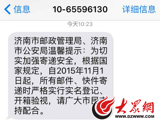 大眾網記者了解到,近日,山東省郵政管理局和濟南市郵政管理局均印發文件或召開會議,推進落實“寄遞物品100%先驗視后封箱,100%實名收寄,郵件、快件100%過機安檢”的“三個100%”措施。11月11日,大眾網記者的手機還收到濟南市郵政管理局、濟南市公安局向市民發出的提示短信:自2015年11月1日起,所有郵件、快件寄遞時嚴格實行實名登記、開箱驗視,請廣大市民支持配合。
