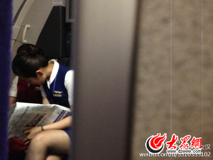 該網友發布的照片,照片中藍衣空姐用手中的報紙遮擋手機。