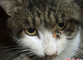 同時,記者還了解到,在“壯壯”受傷后的第三天,“梅暗香”和愛心市民又在岔路街發現一只大白貓被同樣的鋼釘射穿頭部,而且傷口也是在左眼角處!懊钒迪恪闭f,今年春天,在岔路街也曾發生過類似的虐貓事件,當時受傷流浪貓“大寶”已基本痊愈了,但如此殘忍的事情竟然在半年后再次發生。