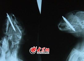“兩只受害貓被鋼釘貫通頭部,濟南岔路街驚現嚴重虐貓事件!苯眨W友“梅暗香”在為微博爆料稱,最近幾天濟南岔路街附近小區連續發現虐貓事件。通過“梅暗香”上傳的照片,記者看到,一只灰白色的小花貓左眼角下方露出一節鋼釘,小貓嘴被醫生撐開后,發現鋼釘已貫穿了上顎和舌根,寵物醫院拍攝的X光片顯示,貫穿小貓頭部的這只鋼釘長達十幾公分。