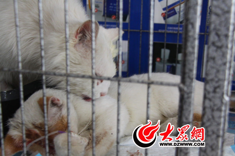 之前被打入三顆鋼釘、現在快要痊愈的叮叮,和剛下手術臺的花花同住一個籠子,看到同伴出來了,叮叮主動上前為它舔舐。