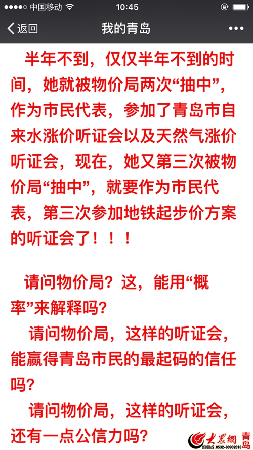 文章稱,前一篇文章發出后,很多人通過后臺留言等提出意見和建議。其中,有一位“自稱是王秀麗”的人現身說法。“她說,她經常喜歡參與各種平臺抽獎活動,從青島信息港,到青島論壇,到微博,到微信,她一直用‘貓貓他媽’這個網名,是知名網友,‘你們可以輕易的百度出來我的點點滴滴,聽證會是因為走訪過水庫水質監測站,覺得比較了解,所以才第一次勇敢的報了名,沒想到就給抽中了,接下來的報名也就順理成章,今后我還會繼續報名參與各種關系到民生的活動。沒有人能阻止我老人家要求進步的決心的,我老人家堅信一個道理,想要發聲,首先要爭取讓別人聽到你的權利,我做到了,你如果沒做到就努力向我老人家學習吧,不要在那里浪費時間整些沒用的,我就跟小貓說,如果你想讓別人聽你的,那么首先你得讓自己站到一個足夠高的地方,讓自己能夠有足夠大的聲音才行。”