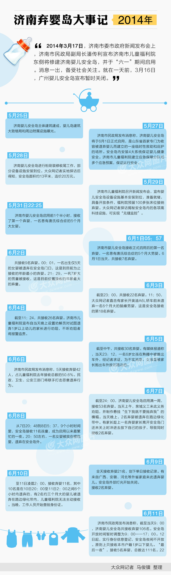 2014年6月11日,濟南市民政局發布消息稱,截至當天9:00,濟南嬰兒安全島共接收棄嬰106名。安全島開放時間暫時調整為9:00——17:00。12日起,實行身份信息登記,安全島夜間不開放。原則上只接收本市戶籍1歲以下嬰兒。“最后一夜”,接收5名棄嬰,總數達111名。22:10分,一名10歲的腦癱女孩被遺棄在馬路中間,打破“年齡最大”紀錄。