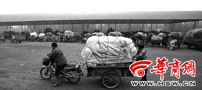 4月21日,濟南市歷城區(qū)唐王鎮(zhèn)司家莊村頭的蔬菜批發(fā)市場上,三十余輛三輪摩托滿載卷心菜等待菜販收購,當日菜價跌到每斤0.22元