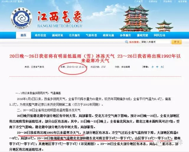 那么,這以假亂真的氣象謠言源自何處?經過多次搜索,大眾網記者最后在江西氣象臺的網站上,找到了類似的信息,但是在今年1月中旬江西省出現嚴寒天氣時發布一條過時的氣象消息,而不是未來的天氣預報信息。