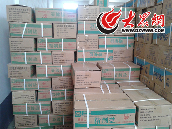滕州市鹽業公司倉庫內,價格較低的精制鹽供貨充足。鹽業公司工作人員提醒市民,不要相信謠言,無論低價的精制鹽,還是價格稍高的低鈉鹽,鹽業公司都會按計劃足量供應,市民沒有搶購的必要。大眾網記者 李兆輝 攝