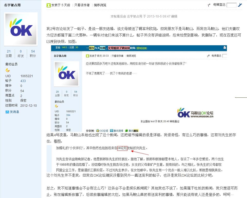 “我2號在論壇發(fā)了一帖子,是說一朋友結(jié)婚,說丈母娘送了輛賓利歐陸,但我朋友不是馬鞍山,而我在馬鞍山,他們夫妻雙方應(yīng)該都屬于富二代那種,一輛車對他們來說不算什么,帖子并沒有詳細說明,后來怕受到影響,我刪除了,現(xiàn)在百度還可以搜到快照,如圖(附圖1),結(jié)果4號凌晨,馬鞍山本地也出現(xiàn)了這個新聞,還把細節(jié)編輯得很是詳細(附圖2),我很奇怪,有這么巧的事情,還有劉先生的存在,看圖這個劉先生并不是我,但我在OK論壇確實沒看到另外一篇送賓利的帖子,也許是我玩OK論壇的比較少吧,總之,我不知道事情會不會有這么巧?這條會不會是娛樂新聞呢?其他我也不說了,如果屬于杜擬的新聞,我只想適可而止,別在編輯新故事了,后續(xù)故事編輯得太爛。如果馬鞍山真的有送賓利的事情,那只能說有錢人還是蠻多的,呵呵……”