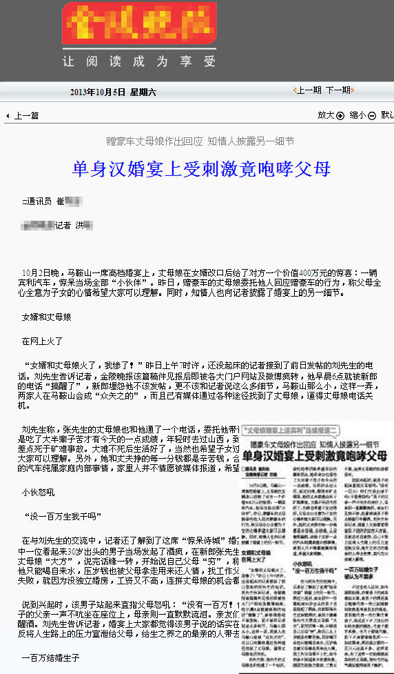 傅中平接著仔細翻看了10月4日、5日的南京某報,這時,他發(fā)現(xiàn)了“通訊員 崔某某 記者 洪某”在10月5日又發(fā)了一篇后續(xù)報道,堪稱“土豪丈母娘”報道的“第二季”。該報道稱:他一早接到爆料人電話,稱婚禮上的丈母娘委托他帶話給希望采訪的媒體朋友,不希望再被媒體報道,爆料人還爆出另一個細節(jié)--一個單身漢婚宴上受刺激竟咆哮父母。