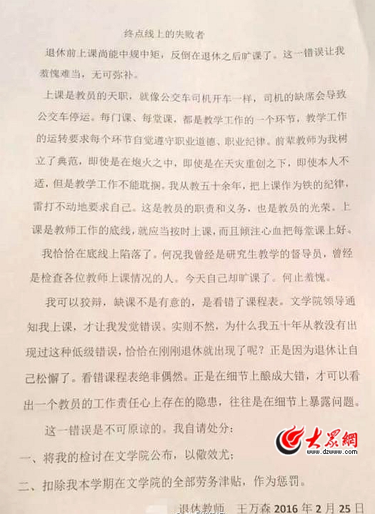大眾網(wǎng)記者采訪王教授得知,2月25日(周四)原本有他的課,可由于他一時(shí)疏忽看錯(cuò)了課表,看成是下周一的課。事后,他接到學(xué)校的電話,問自己怎么沒來上課,才意識(shí)到自己的錯(cuò)誤。他說,這星期已經(jīng)無法彌補(bǔ)上這一堂課了,于是當(dāng)晚就寫下了檢討,在3月3日的課上當(dāng)堂念了這份檢討。“我作為一個(gè)老教師,從教五十多年,卻在最后的時(shí)刻沒把課按時(shí)上好,感覺十分羞愧。”