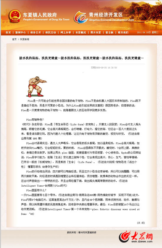 同時,網友“MRWF”還將該政府網站的截圖和地址鏈接(http://qzrsj.gov.cn )發到了網上。根據網友提供的鏈接,記者點擊進入了東夏鎮人民政府網站,發現該政府網站首頁設置了“東夏動態”、“熱點鎮區”、“黨務信息”等欄目,但各個欄目下多數文章內容的標題均為“能水洗的鼠標,洗洗更健康”,點擊進入后文章內容是一個關于“Pleo”電子寵物產品的介紹,在頁面的醒目位置還有一個搞笑的FLASH動畫。