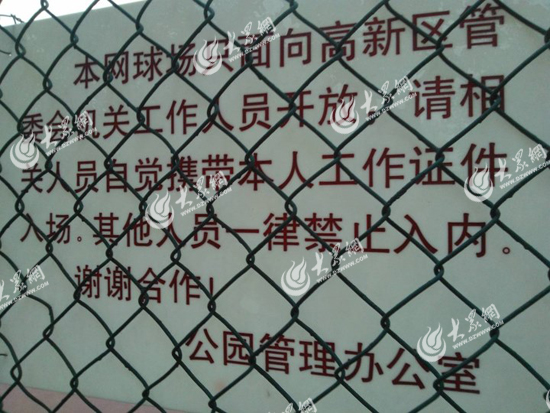 大眾網濟南6月20日訊(記者 盛堃)“公園的場地,只向高新區的機關工作人員開放,這算什么道理?”今天下午,網友杜女士向本網反映:淄博市高新區火炬公園內的網球場掛著牌子,稱該場地只向高新區管委會機關工作人員開放。大眾網記者立即對此事進行調查,淄博高新區林業與園林管理處工作人員接受采訪時對此事含糊其辭,稱“馬上去摘掉”。