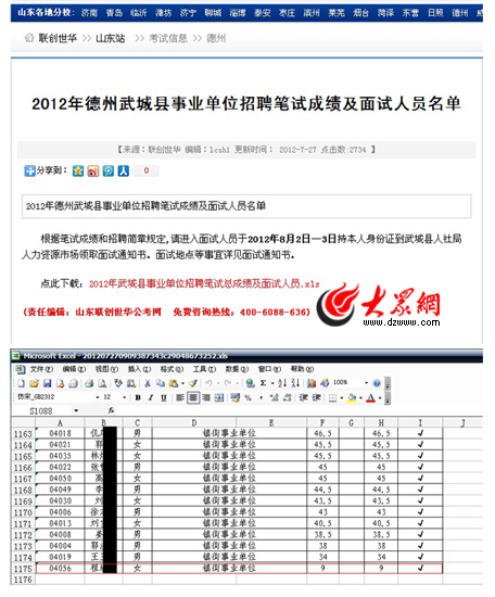 “超低分考生入面試”事件難道是該網(wǎng)友自編自演的一出戲?隨后,大眾網(wǎng)記者在百度中搜索“武城縣2012年事業(yè)編考試成績(jī)查詢”,在公考教育機(jī)構(gòu)“聯(lián)創(chuàng)世華”的官方網(wǎng)站上,記者再次下載了一份武城縣事業(yè)編成績(jī)及面試情況公示名單,在該名單中,“9分考生”程某則被標(biāo)注了“√”,明確其是入圍面試的。隨后,記者電話咨詢了“聯(lián)創(chuàng)世華”網(wǎng)站客服人員,客服人員告訴記者,“聯(lián)創(chuàng)世華”網(wǎng)站上公布的名單轉(zhuǎn)載于武城縣人民政府網(wǎng)站,在轉(zhuǎn)載后,該縣網(wǎng)站又對(duì)名單進(jìn)行了更改,但“聯(lián)創(chuàng)世華”網(wǎng)站沒有同步更新。