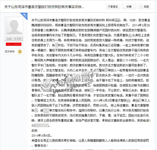 李某在帖文中描述,2014年3月28日上午11:30許,他騎摩托車行至魏灣鎮戶花園村西頭時,遇到交警人員流動查車,他被交警查住后棄車逃跑。隨后,他被追上的協勤張某抓摔倒在地,右大腿受傷疼痛。李某向張某求救,交警人員把他拉起后猛摔到地上,后將其塞進警車,拉至曹縣交警大隊。交警奪走他的手機,把他關在警車內兩個多小時,直到下午2:30左右,協勤張某等四人將他送到了醫院。