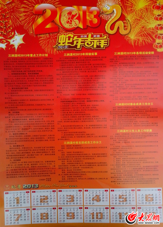 三澗溪村2013年新年掛歷印著該村2013年重點(diǎn)工作計(jì)劃等內(nèi)容。