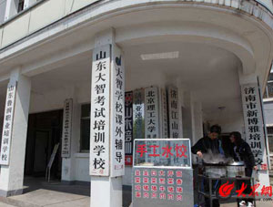 不但是到學校門口來派發廣告,越來越多的補習班已經開始在各個學校的周圍“安營扎寨”,在山師附小和附中的周圍,就云集著新東方、大智學校、阿里斯頓等數十家教育培訓機構 。