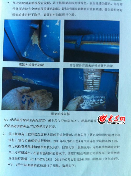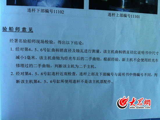 西霞口船業有限公司立即委托青島雙誠船舶技術咨詢有限公司對1號船主機進行了鑒定檢驗,結論是:該主機是翻新后的二手主機!