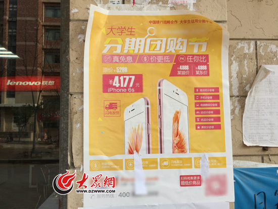 山東師范大學(xué)長(zhǎng)清校區(qū)內(nèi),一張網(wǎng)貸平臺(tái)的海報(bào)宣傳大學(xué)生分期團(tuán)購(gòu)節(jié)的活動(dòng)。