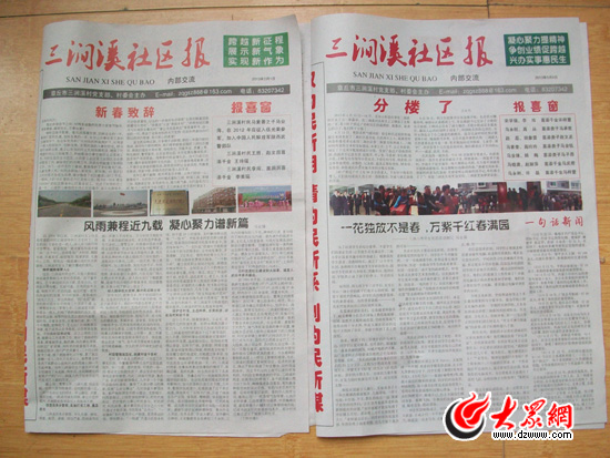 “新春賀詞、工作報告、報喜窗、書記訪談……”春節(jié)前后,章丘市雙山街道三澗溪社區(qū)(原三澗溪村)自辦的《三澗社區(qū)報》第四期陸續(xù)發(fā)到了社區(qū)的每家每戶。這張小小的社區(qū)報說的都是身邊的人,講的都是村里的事,投稿的“記者”也都是社區(qū)里的老百姓。大眾網記者了解到,社區(qū)報既是三澗溪社區(qū)政務公開的窗口,又是反映民情的平臺,還是社區(qū)居民展示才藝、吐露心聲的舞臺,因此成為全村人最搶手的報刊。