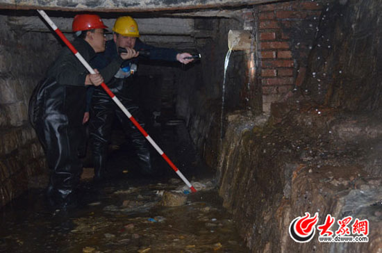 21日下午4時許,大眾網記者跟隨濟南市排水管理服務中心、歷下區環保局的工作人員來到朝山街銀座佳驛酒店,工作人員砸開了壓在銀座佳驛一處板房下的排污檢測井。據工作人員介紹,排向護城河的污水管線就是從這里延伸至雨水泄洪通道,進而流入濟南護城河。井口被打開后,歷下環保局工作人員抽取了水樣,以備進一步測試污水的濃度。