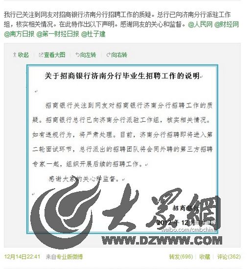 針對媒體與網友的質疑,招商銀行昨晚在官網和微博上發布了《關于招商銀行濟南分行畢業生招聘工作的說明》。回應稱:“招商銀行關注到網友對招商銀行濟南分行招聘工作的質疑。招商銀行總行已向濟南分行派駐工作組,核實相關情況。如有違規行為,將嚴肅處理。目前,濟南分行招聘即將進入第二輪面試環節,總行派出的招聘團隊將會同外聘的第三方招聘專家一起,組織開展后續的招聘工作!