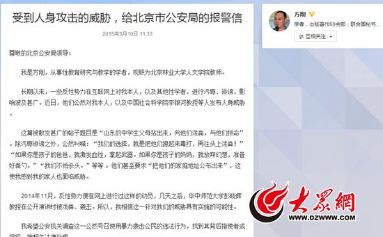 針對(duì)反對(duì)者發(fā)布的“潑糞”一文,方剛于3月10日在微博公布給北京公安的報(bào)警信,稱受到人身攻擊。