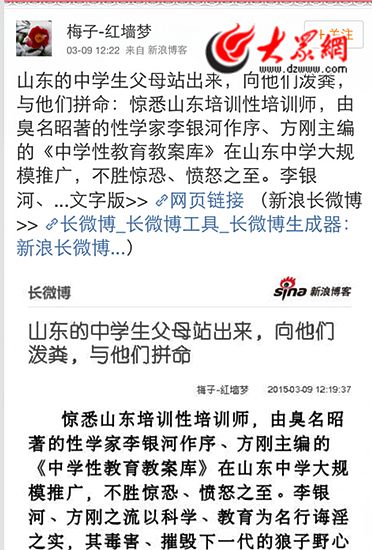 微博博主@梅子-紅墻夢(mèng)3月9日發(fā)布博文,號(hào)召山東的中學(xué)生父母共同抵制《中學(xué)性教育教案庫(kù)》一書在山東推廣。