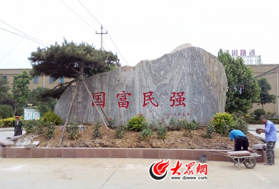 5月29日上午10點,大眾網(wǎng)記者來到了位于工業(yè)北路附近的張馬屯村。從工業(yè)北路往南,離著村口還有幾十米時,大眾網(wǎng)記者就看到一塊高五六米的巨石立在村前,走進村里,繞到大石頭的南面,能看到石頭上刻著“國富民強”四個大紅字。