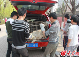 在這只“母狼”被帶走前,大眾網記者與其進行了接觸。記者發現,這只“母狼”不僅能聽懂記者喚狗的聲音,而且溫順地走到記者的身邊,并允許記者用手撫摸其頭部。圍觀的大部分市民都稱與旁邊籠子里的狼相比,這只“母狼”體型明顯偏小。